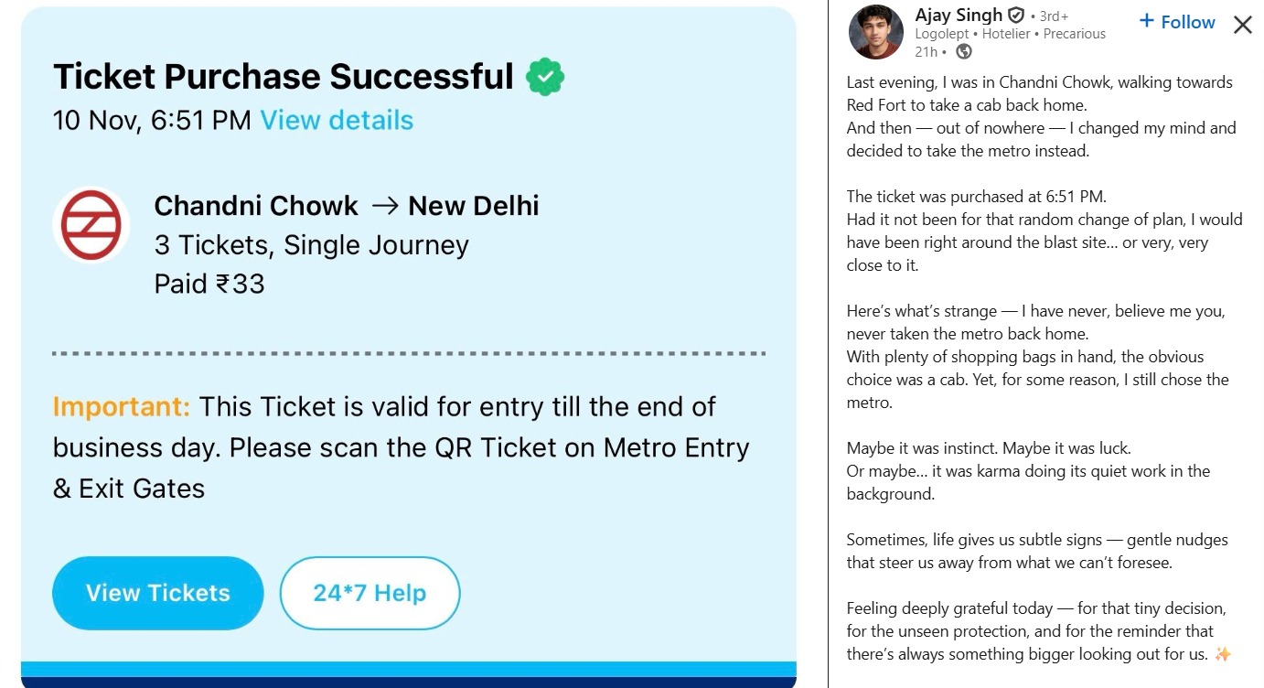 कहते हैं कि जो होता है, अच्छे के लिए होता है। हिमाचल प्रदेश के मनाली के कारोबारी अजय सिंह लाल किला के पास हुए ब्लास्ट से इसलिए बच सके, क्योंकि उन्होंने आखिरी समय में अपना मन बदल लिया था। सोमवार को लाल किला के पास जिस जगह ब्लास्ट हुआ, उसी जगह पर कुछ देर पहले तक अजय सिंह थे। वह घर जाने के लिए कैब करने वाले थे लेकिन उन्होंने फिर मेट्रो से जाने का फैसला लिया। ब्लास्ट से सिर्फ एक मिनट पहले ही उन्होंने मेट्रो की टिकट ली थी।