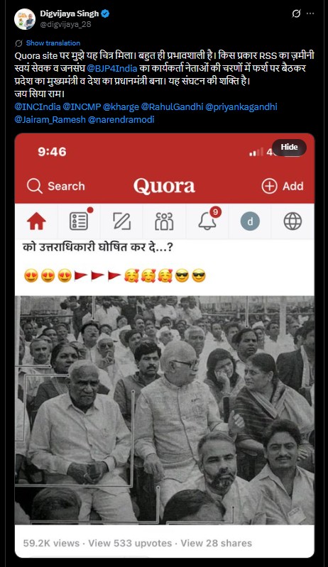 दिग्विजय सिंह ने अपने आधिकारिक एक्स अकाउंट पर लिखा, 'Quora site पर मुझे यह फोटो मिला है। बहुत ही प्रभावशाली है। किस तरह आरएसएस का जमीनी स्वयंसेवक और जनसंघ का कार्यकर्ता नेताओं की चरणों में फर्श पर बैठकर प्रदेश का मुख्यमंत्री और देश का प्रधानमंत्री बना। यह संघटन की शक्ति है। जय सिया राम।'