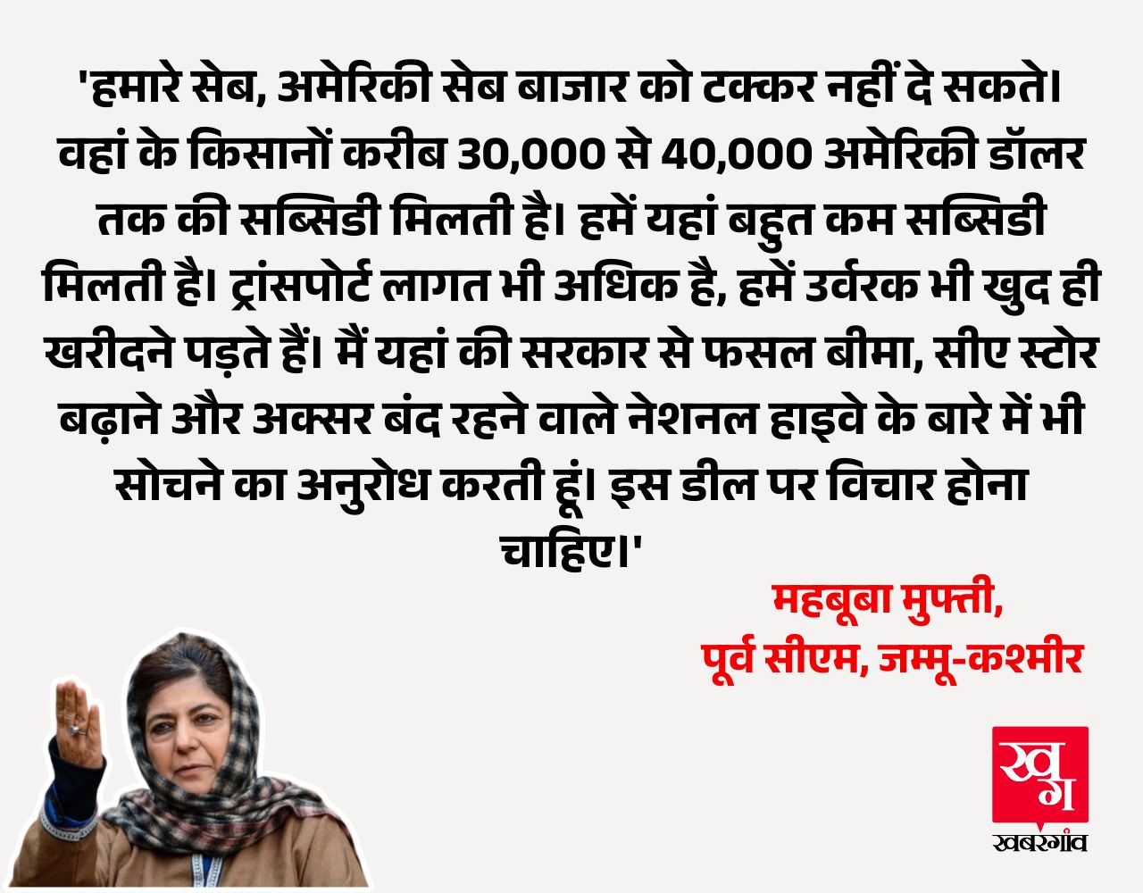 महबूबा मुफ्ती, इसका उपाय भी सुझा रही हैं। उनका कहना है कि प्रधानमंत्री को समझौते पर फिर से सोचना चाहिए। सेब के आयात पर कम से कम 50 फीसदी टैरिफ लगाना चाहिए।