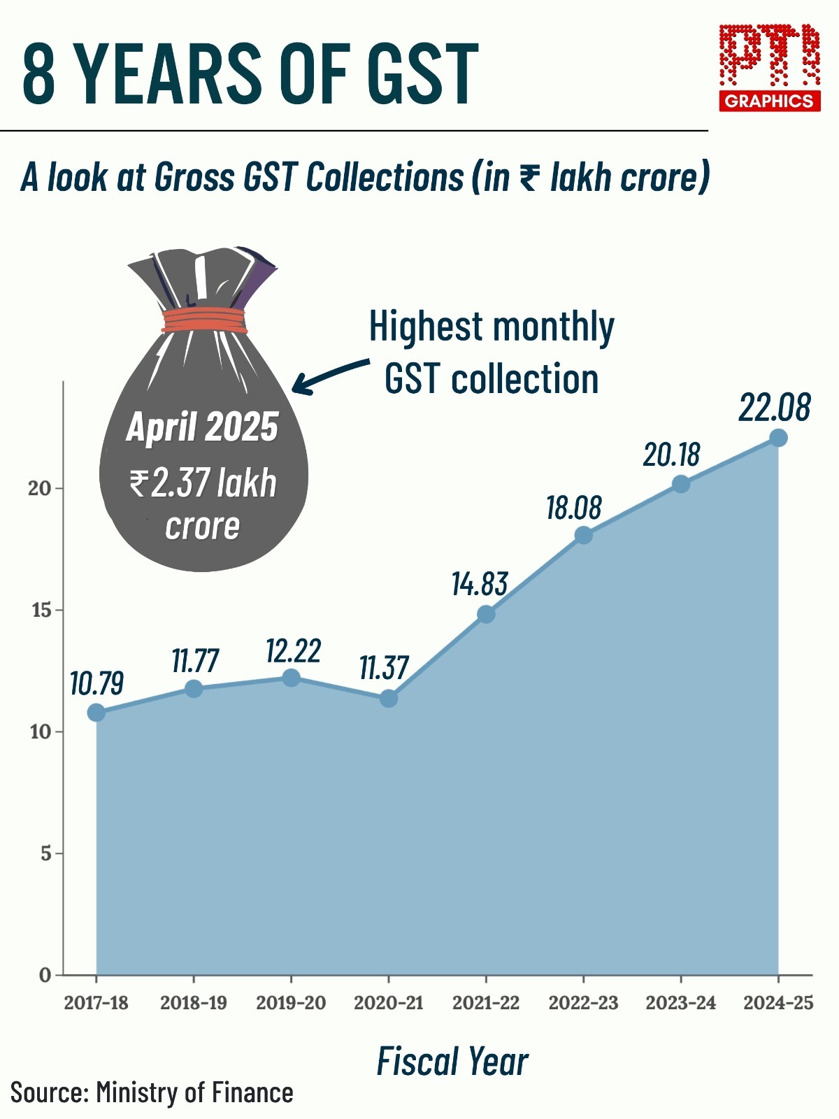 सरकार हर महीने GST कलेक्शन का डेटा देती है। इसके मुताबिक, भारत का GST कलेक्शन लगातार बढ़ रहा है। 2018-19 में सरकार को 11.77 लाख करोड़ रुपये GST से मिले थे। 2024-25 में यह बढ़कर 22.08 लाख करोड़ रुपये हो गया। यानी, सरकार का GST कलेक्शन सीधे-सीधे दोगुना बढ़ गया।