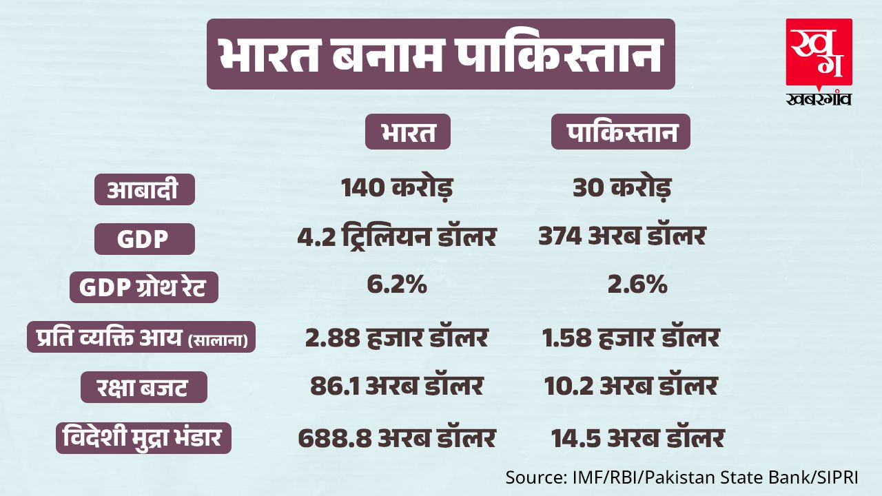 आज भारत दुनिया की चौथी सबसे बड़ी अर्थव्यवस्था है। भारत की GDP 4.2 ट्रिलियन डॉलर है। वहीं, पाकिस्तान की 374 अरब डॉलर के आसपास है। इसका मतलब हुआ कि आज के समय में भारत और पाकिस्तान की GDP में 10 गुना से भी ज्यादा बड़ा अंतर है। IMF का अनुमान है कि 2027 तक भारत की GDP 5 ट्रिलियन और 2029 तक 6 ट्रिलियन डॉलर के पार चली जाएगी।