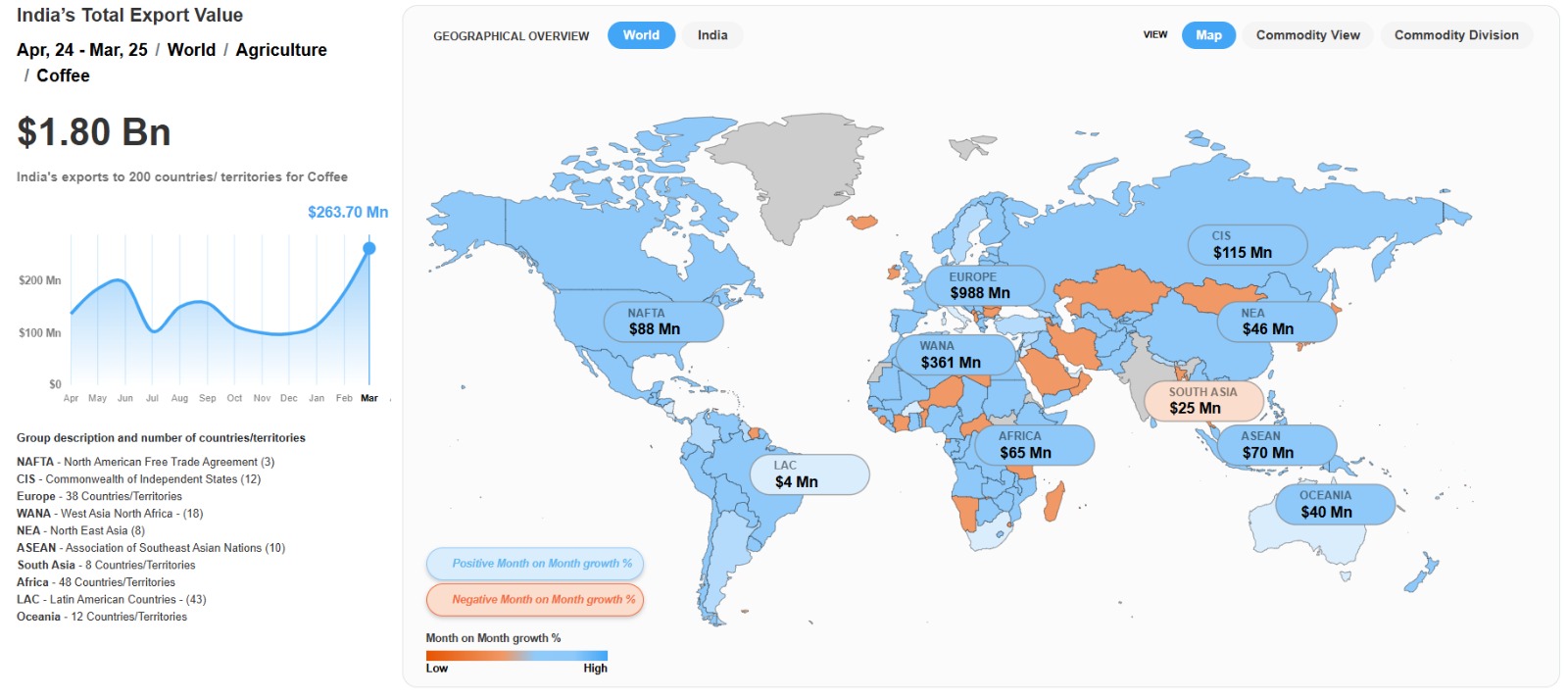 2025-26 में भारत ने इटली में 32.6 करोड़ डॉलर की कॉफी का एक्सपोर्ट किया था। इसके बाद जर्मनी को लगभग 20 करोड़ डॉलर और बेल्जियम को 13.4 करोड़ डॉलर की कॉफी एक्सपोर्ट की थी। रूस को 9.52 करोड़ डॉलर, संयुक्त अरब अमीरात को 9.17 करोड़ डॉलर और अमेरिका को 8.18 करोड़ डॉलर की कॉफी एक्सपोर्ट की गई थी।