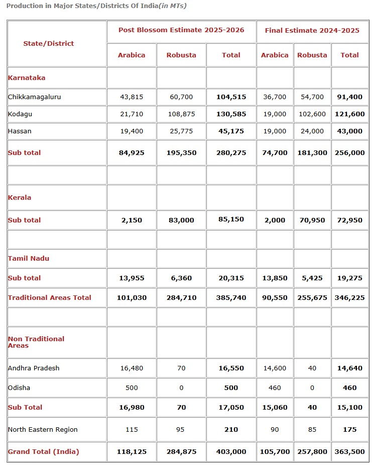 कर्नाटक में तीन जगहों- चिकमंगलुरू, कोडागू और हासन में कॉफी की खेती होती है। इसमें भी सबसे ज्यादा कोडागू में होती है। 2025-26 में कर्नाटक में 2,80,275 टन पैदावार होने की उम्मीद है। इसी तरह केरल में 81,150 टन और तमिलनाडु में 20,315 टन उत्पादन होने की संभावना है। इन तीनों राज्यों में 2025-26 में कॉफी का 3,85,740 टन उत्पादन होने का अनुमान लगाया गया है।