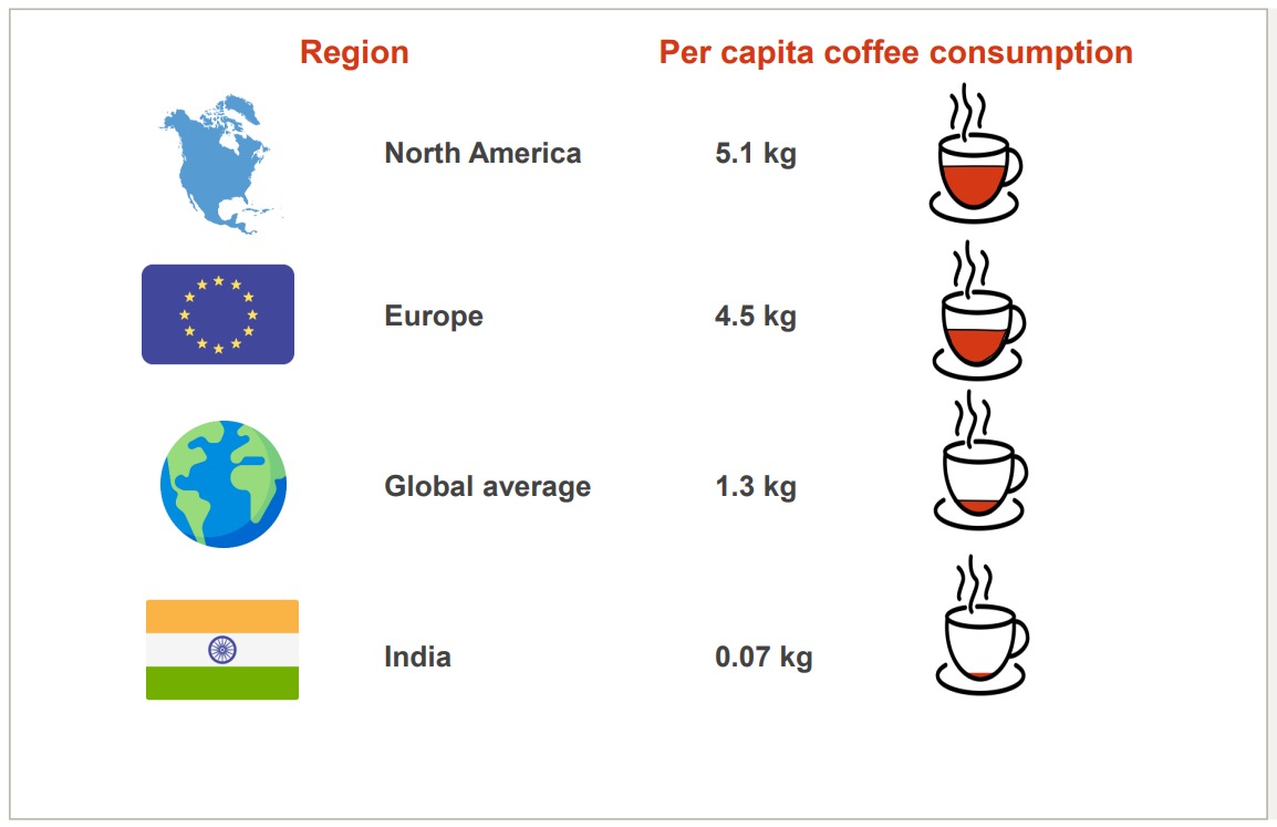 दुनियाभर में कॉफी की सबसे ज्यादा खपत अमेरिका और यूरोप में होती है। अमेरिका में हर व्यक्ति सालभर में औसतन 5.1 किलो कॉफी की खपत करता है। वहीं, यूरोप में रहने वाला हर व्यक्ति सालाना औसतन 4.5 किलो की खपत करता है। भारतीय इस मामले में बहुत पीछे हैं। हर भारतीय औसतन सिर्फ 67 ग्राम की खपत ही करता है।