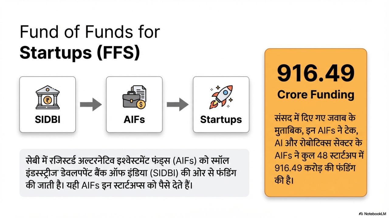 सेबी में रजिस्टर्ड अल्टरनेटिव इन्वेस्टमेंट फंड्स (AIFs) को स्मॉल इंडस्ट्रीज डेवलपमेंट बैंक ऑफ इंडिया (SIDBI) की ओर से फंडिंग की जाती है। यही AIFs इन स्टार्टअप्स को पैसे देते हैं। संसद में दिए गए जवाब के मुताबिक, इन AIFs ने टेक, AI और रोबोटिक्स सेक्टर के AIFs ने कुल 48 स्टार्टअप में 916.49 करोड़ की फंडिंग की है।