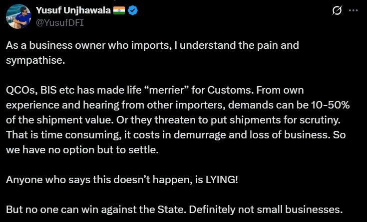 कंपनी की इस पोस्ट पर यूसुफ उंझावाला ने प्रतिक्रिया देते हुए लिखा, 'एक इम्पोर्टर होने के नाते मैं इस दर्द को समझ सकता हूं। मेरा अपना एक्सपीरियंस और दूसरे इम्पोर्टर से सुनने के बाद पता चला कि माल की कीमत का 10 से 50% तक मांगा जा सकता है। या फिर माल की जांच करने की धमकी देते हैं। इसमें समय लगता है और कारोबार का नुकसान होता है। इसलिए हमारे पास समझौता करने के अलावा कोई और रास्ता नहीं होता।'