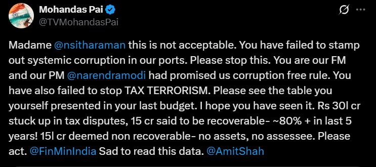 मोहनदास पाई ने पोस्ट में लिखा, 'मैडम सीतारमण, यह बर्दाश्त के काबिल नहीं है। आप हमारे पोर्ट्स में सिस्टमैटिक करप्शन को रोकने में फेल रहीं हैं। प्लीज इसे रोकिए। आप हमारी वित्त मंत्री हैं और हमारे प्रधानमंत्री नरेंद्र मोदी ने हमसे करप्शन-फ्री शासन का वादा किया था।' उन्होंने यह भी कहा कि वित्त मंत्री 'टैक्स टेररिज्म' को रोकने में भी नाकाम रही हैं।