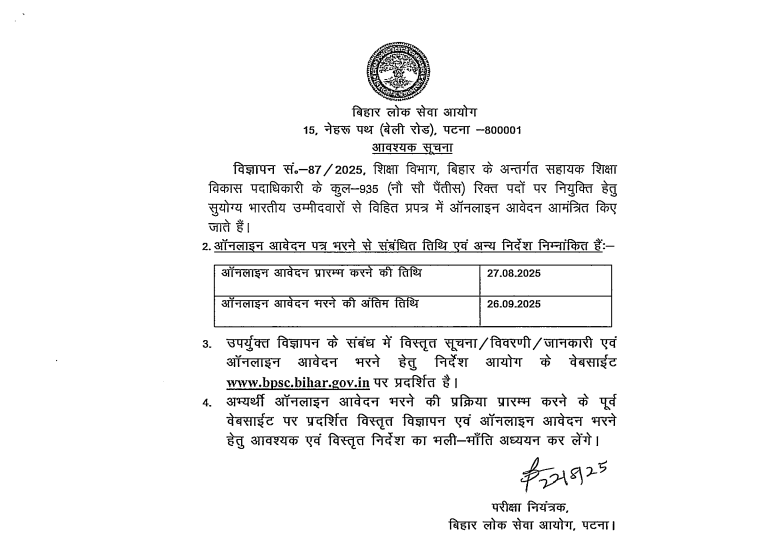 — Bihar Public Service Commission (@BPSCOffice) August 22, 2025
