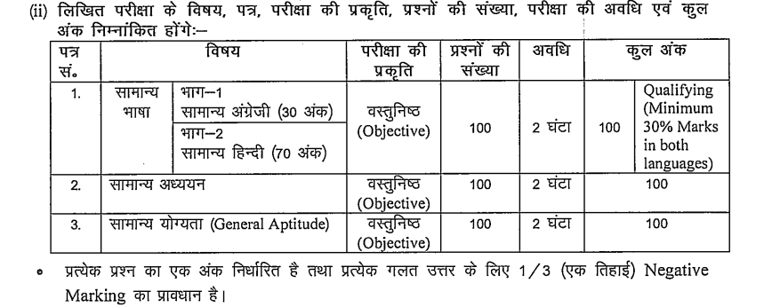 इनमें हर एक पेपर 100 नंबरों का होगा और हर पेपर के लिए 2 घंटे का समय दिया जाएगा। इसमें आपसे हिंदी, इंग्लिश, जनरल एप्टीट्यूड और जनरल स्टडीस के सवाल किए जाएंगे। हिंदी और इंग्लिश का पेपर क्वालिफाइंग होगा। इन पेपरों में न्यूनतम 30 प्रतिशत नंबर लाना जरूरी होगा। अगर इनमें 30 प्रतिशत नंबर नहीं आए तो अन्य विषयों का पेपर चेक नहीं किया जाएगा। आयोग ने नोटिफिकेशन में कहा, 'सामान्य अंग्रेजी और सामान्य हिन्दी के पत्र में न्यूनतम प्राप्तांक नहीं प्राप्त होने पर अभ्यर्थिता पर विचार नहीं किया जायेगा।'