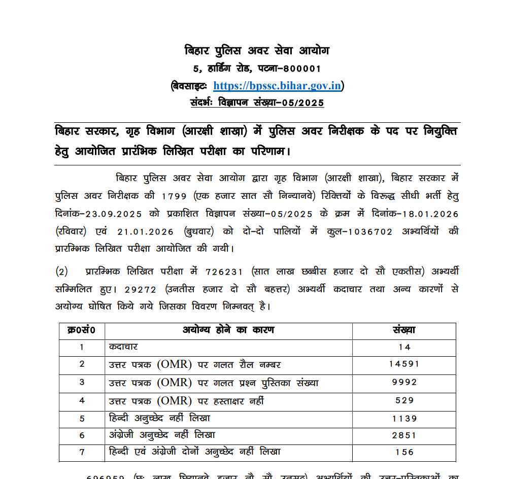 बिहार पुलिस अधीनस्थ सेवा आयोग (BPSSC) ने बिहार पुलिस (SI) भर्ती की प्रारंभिक परीक्षा का रिजल्ट जारी कर दिया है। इस परीक्षा का आयोजन 18 जनवरी और 21 जनवरी 2026 को हुआ था। इस रिजल्ट का इंतजार प्रदेश के करीब 6 लाख युवा कर रहे थे और इस भर्ती के जरिए 1799 पदों को भरा जाएगा। इस भर्ती के लिए प्रीलिम्स में सफल उम्मीदवरों को मेन एग्जाम देना होगा।