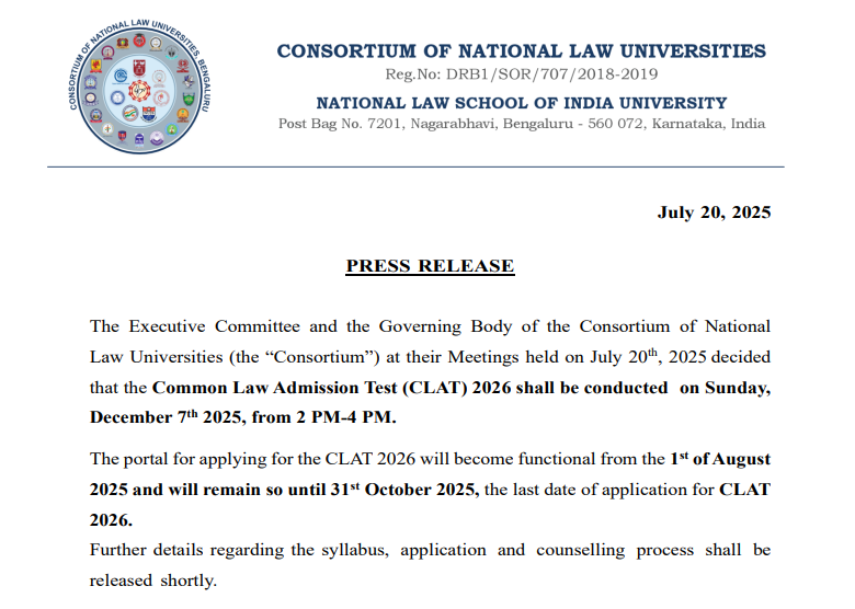 इस एंट्रेस के आधार पर ही देश की टॉप लॉ यूनिवर्सिटीज में एडमिशन मिलेगा। हर साल लाखों छात्र इस एंट्रेस एग्जाम में बैठते हैं। CLAT 2026 के लिए के लिए रजिस्ट्रेशन की अंतिम तारीख 31 अक्टूबर 2025 है। यह परीक्षा 7 दिसंबर 2025 को एक ही शिफ्ट में दोपहर 2 बजे से 4 बजे तक होगी। देशभर में अलग-अलग शहरों में इस परीक्षा के केंद्र बनाए जाते हैं।