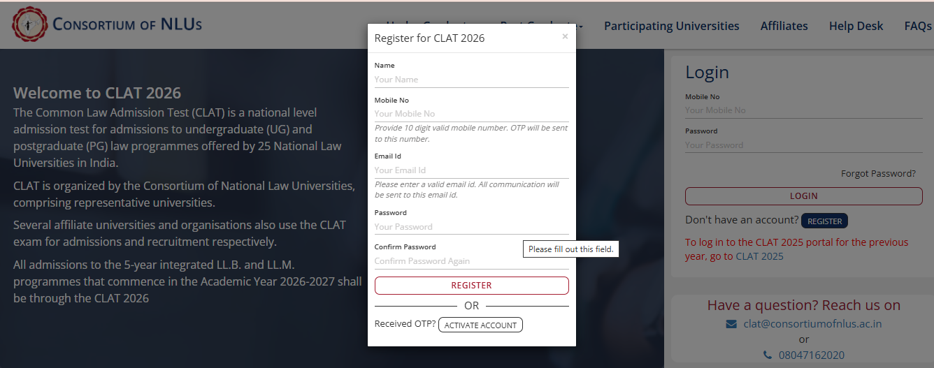 - होमपेज पर 'Register for CLAT 2026' पर क्लिक करें