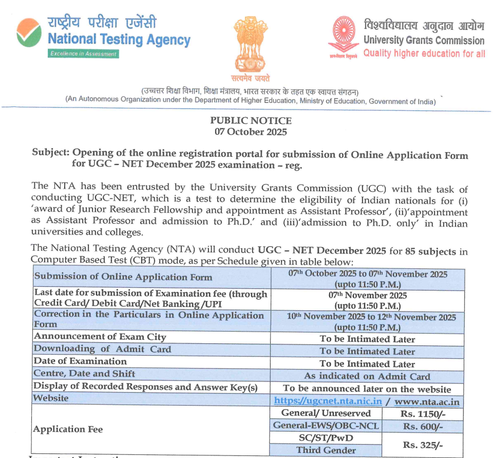 NTA ने UGC NET दिसंबर 2025 के लिए रजिस्ट्रेशन प्रोसेस शुरू कर दी है। उम्मीदवार आधिकारिक वेबसाइट ugcnet.nta.nic.in पर जाकर 7 नवंबर तक अप्लाई कर सकते हैं।