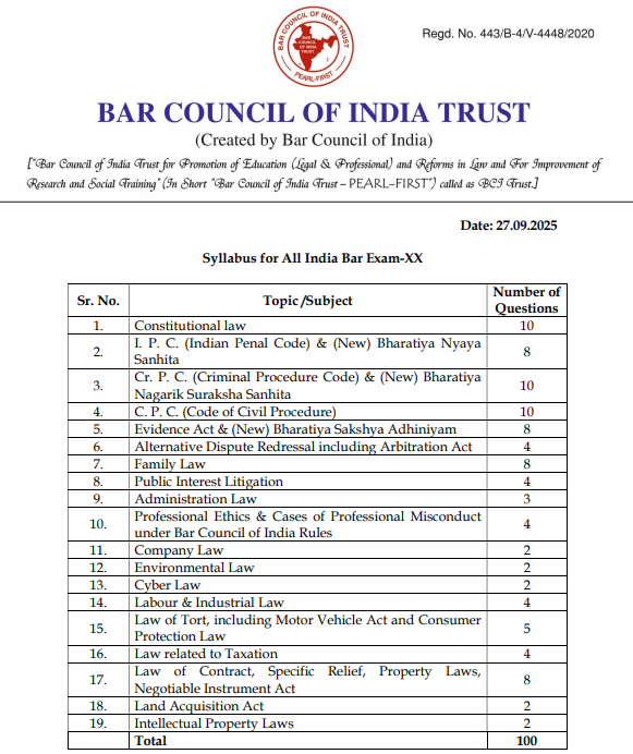 बार काउंसिल ऑफ इंडिया इस परीक्षआ को हर साल आयोजित करता है। यह ऑफलाइन पेन पेपर मोड में होने वाली परीक्षा है। इस परीक्षा को पास करने वाली उम्मीदवारों को सर्टिफिकेट ऑफ प्रैक्टिस जारी कर दिया जाता है। इस साल यह परीक्षा 30 नवंबर को आयोजित की जाएगी। इसके नतीजे जनवरी 2026 तक आ सकते हैं। इस परीक्षा के लिए वैसे तो तीन साल या फिर पांच साल की लॉ डिग्री होना जरूरी है लेकिन लॉ फाइनल ईयर के स्टूडेंट्स भी इस परीक्षा में बैठ सकते हैं।