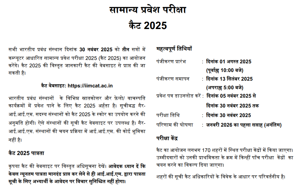 इंडियन इंस्टीट्यूट ऑफ मैनेजमेंट (IIM) और देश के 1,000 से ज्यादा MBA कॉलेजों में एडमिशनन लेने के लिए कॉमन एडमिशन टेस्ट (CAT) देना होता है। यह नेशनल लेवल पर होने वाली परीक्षा है और इस परीक्षा के जरिए देश के टॉप मैनेजमेंट कॉलेजों में एडमिशन होती है। इस साल CAT परीक्षा के लिए रजिस्ट्रेशन प्रक्रिया पूरी हो चुकी है और अभी उम्मीदवारों को अप्लीकेशन फॉर्म में हुई गलती को सुधारने का मौका दिया गया है। 4 अक्टूबर 2025 से CAT का एप्लिकेशन करेक्शन विंडो खोल दिया गया है। अगर आपने फॉर्म में कोई गलती कि है तो आप 7 अक्टूबर तक अपना फॉर्म सही कर सकते हैं।