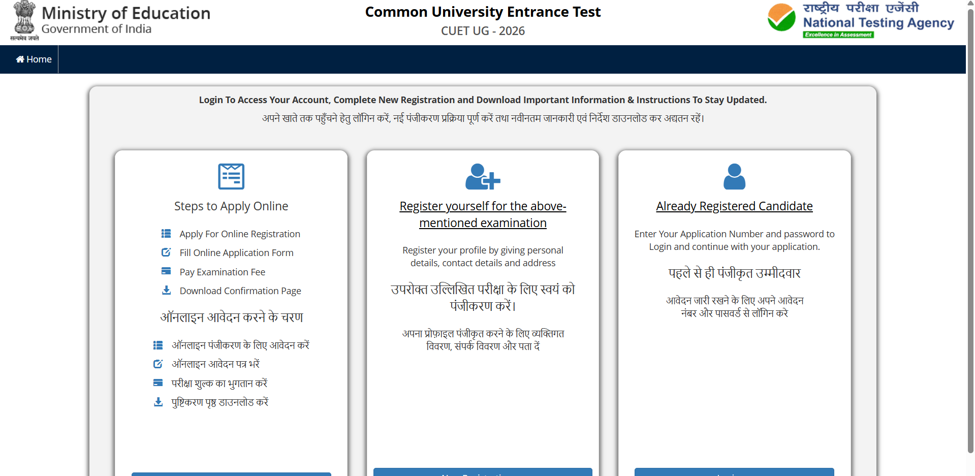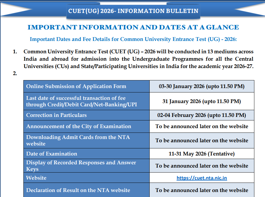 CUET UG 2026 के लिए ऑनलाइन रजिस्ट्रेशन 3 जनवरी 2026 से शुरू हो चुका है। छात्र आधिकारिक वेबसाइट https://cuet.nta.nic.in/registration-for-cuetug-2026-is-live/ पर जाकर फॉर्म भर सकते हैं। रजिस्ट्रेशन की आखिरी तारीख 30 जनवरी है। आप एनटीए की वेबसाइट पर पूरी डिटेल्स देख सकते हैं। रजिस्ट्रेशन करने के बाद आपको निर्धारित फीस जमा करनी होगी और उसके बाद आपको फॉर्म सब्मिट हो जाएगा।