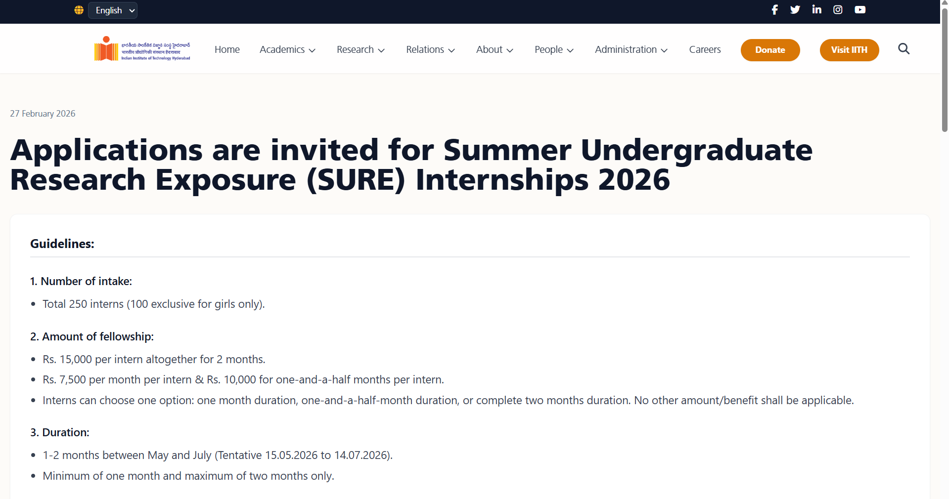 आवेदन के लिए आधिकारिक पोर्टल पर जाकर फॉर्म भरें, सीवी, मार्कशीट और टॉप 20 प्रतिशत प्रमाण-पत्र अपलोड करें। इसके लिए आप https://iith.ac.in/research/SURE/ लिंक पर जा सकते हैं। सिलेक्टिड छात्रों की लिस्ट 15 अप्रैल 2026 तक वेबसाइट पर जारी की जाएगी और ईमेल के जरिए सूचना दी जाएगी।