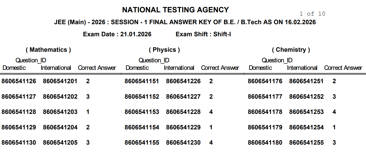 आंसर की आधिकारिक वेबासइट https://jeemain.nta.nic.in पर जारी की गई है। इस वेबसाइट पर जाकर आपको होम पेज में न्यूज सेक्शन में जाना हैं। वहां सबसे ऊपर आपको 'Final Answer Keys of JEE(Main)-2026 [Session-I] [Paper-I (B.E. / B.Tech)]' लिंक मिलेगा। इस लिंक पर क्लिक करते ही आपके सामने एक पीडीएफ ओपन हो जाएगी, जिसमें फाइनल आंसर दिए गए हैं।
