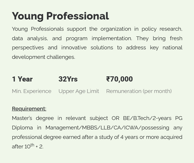 इसी तरह आयुष मंत्रालय ने भी यंग प्रोफेशनल पदों पर भर्ती निकाली है, जिसमें सिलेक्टिड उम्मीदवारों को लगभग 40,000 रुपये हर महीने सैलरी मिलती है। इसके अलावा नीति आयोग में भी यंग प्रोफेशनल की भर्ती निकली है।