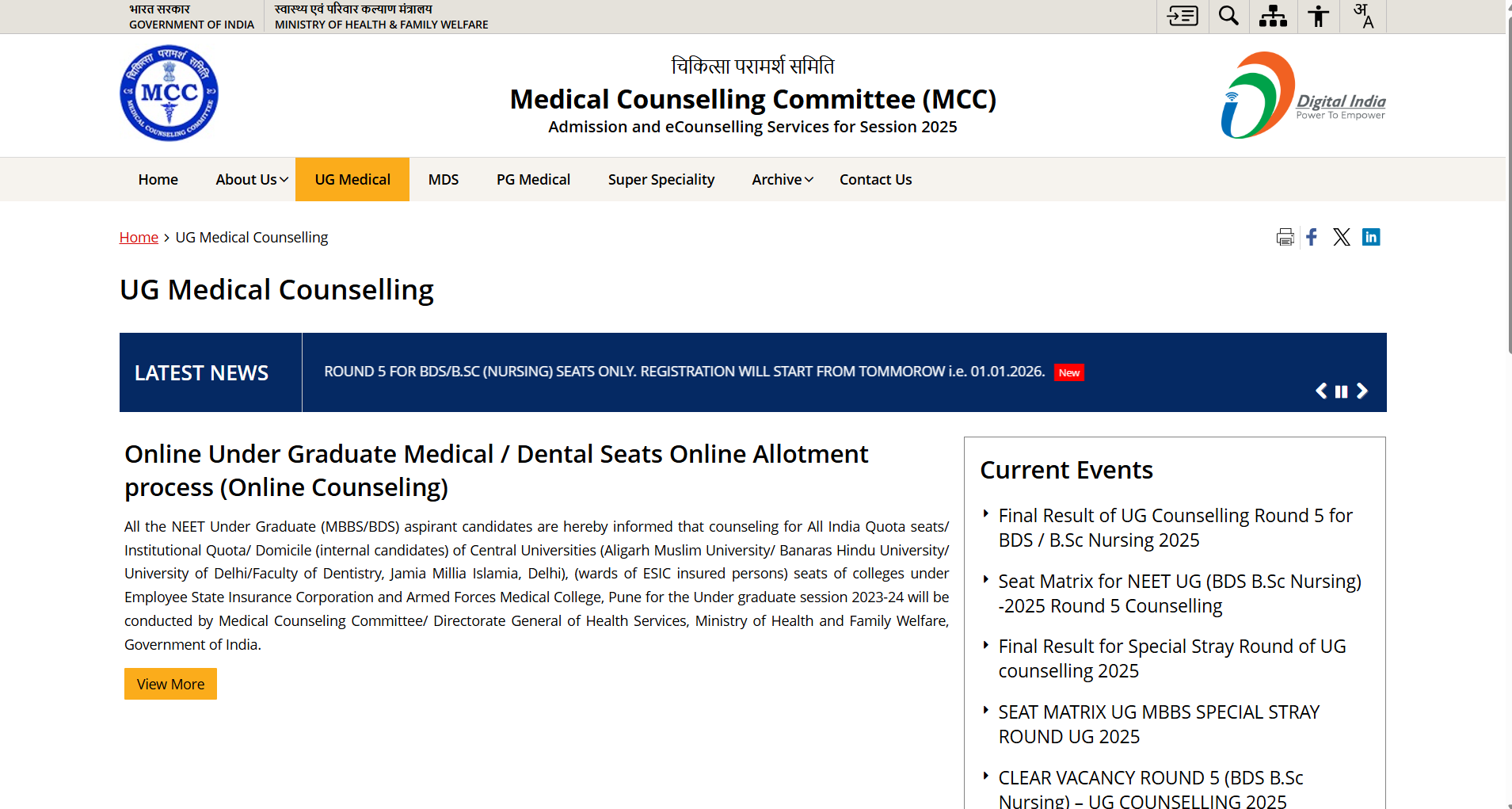 मेडिकल काउंसलिंग कमेटी (MCC) ने बीडीएस और बीएससी नर्सिंग की बची हुई खाली सीटों पर दाखिले के लिए पांचवे राउंड की काउंसलिंग का रिजल्ट जारी कर दिया है। जिन भी उम्मीदवारों ने पांचवे राउंड की काउंसलिंग में हिस्सा लिया था, वे अपना रिजल्ट चेक कर सकते हैं और देख सकते हैं कि उन्हें इस राउंड में सीट मिली है या नहीं। रिजल्ट देखने के लिए उम्मीदवारों को mcc.nic.in वेबसाइट पर जाना होगा। यह मेडिकल काउंसलिंग कमेटी की आधिकारिक वेबसाइट है।