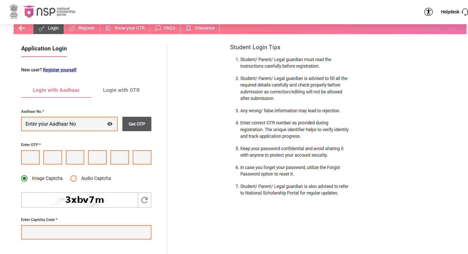 NSP पर वन टाइम रजिस्ट्रेशन (OTR) करें, आधार या ईमेल यूज करके। स्कीम सिलेक्ट करें, फॉर्म में डिटेल्स भरें और डॉक्यूमेंट्स (मार्कशीट, इनकम/कास्ट सर्टिफिकेट) अपलोड करें। सबमिट करने के बाद स्टेटस ट्रैक करें। अगर कोई इश्यू हो, तो हेल्पलाइन 0120-6619540 पर कॉल करें। डायरेक्ट बेनिफिट ट्रांसफर (DBT) से पैसे आपके अकाउंट में आएंगे।