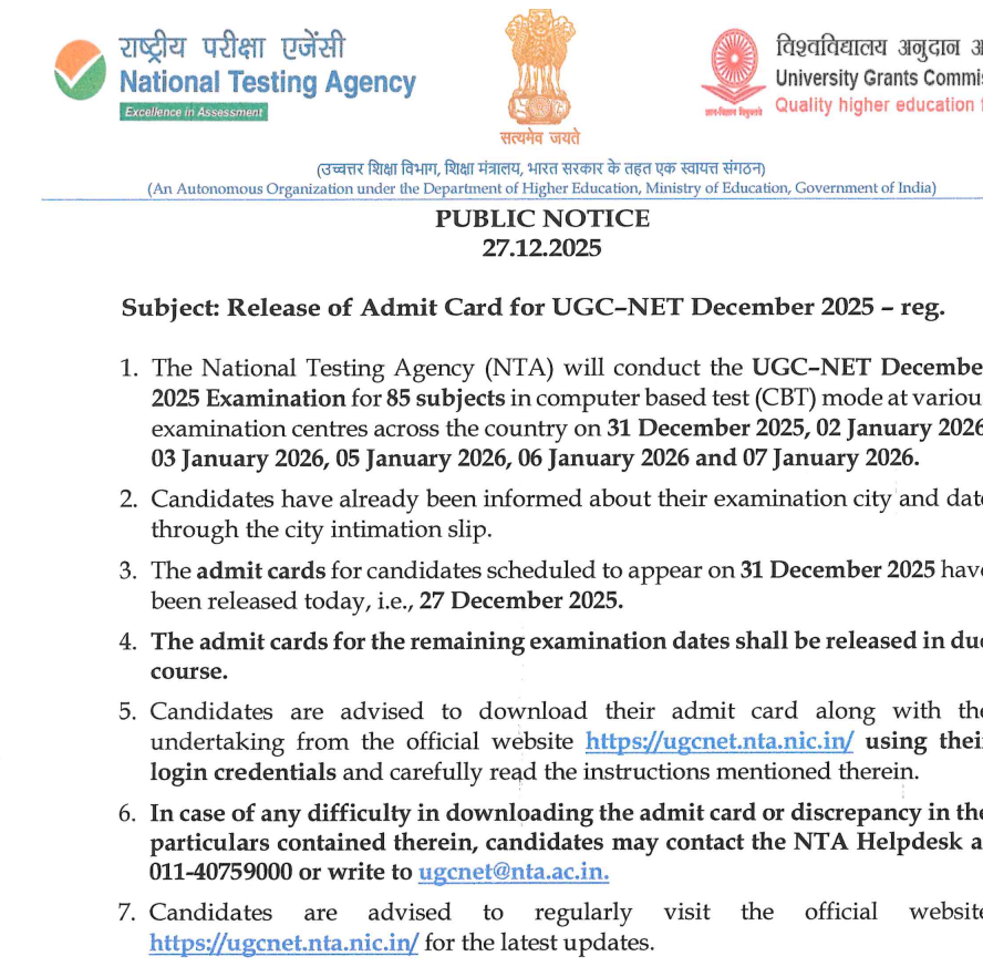 नेशनल टेस्टिंग एजेंसी (एनटीए) ने 31 दिसंबर की यूजीसी नेट दिसंबर 2025 सेशन की परीक्षा के लिए एडमिट कार्ड जारी कर दिए हैं। अगर आपने भी यूजीसी नेट का फॉर्म भरा है तो आप अब इस पीरक्षा के लिए अपना एडमिट कार्ड यानी हॉल टिकट आधिकारिक वेबसाइट ugcnet.nta.nic.in पर जाकर डाउनलोड कर सकते हैं। नेट की परीक्षा 31 दिसंबर से शुरू हो रही हैं। देशभरम में अलग-अलग केंद्रों पर यह परीक्षा होगी। परीक्षा केंद्र पर जाने के लिए एडमिट कार्ड होना बेहद जरूरी है।