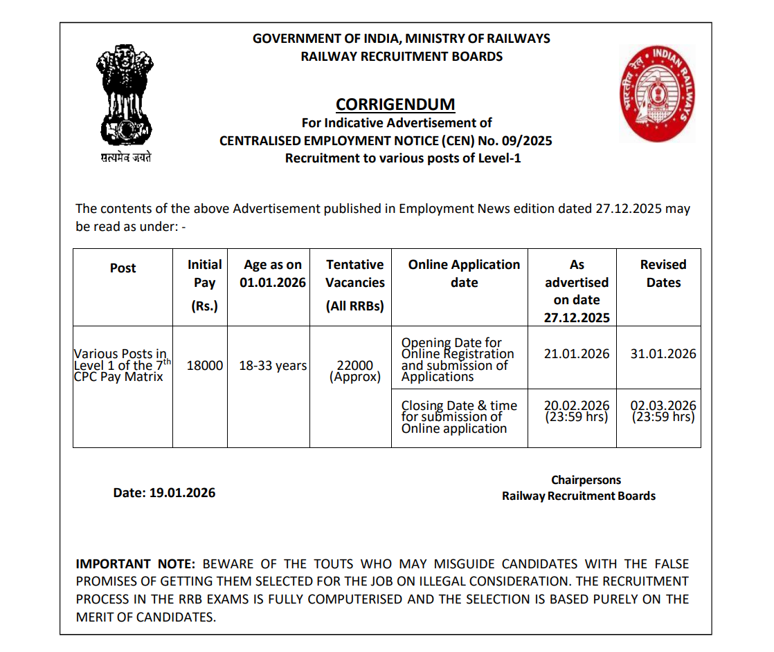 इस भर्ती के लिए 27 दिसंबर 2025 को नोटिफिकेशन जारी किया गया था। इस नोटिफिकेशन में करीब 22,000 वैकेंसी पर भर्ती करने के बारे में कहा गया था। रेलवे के विभिन्न जोन्स और विभागों में इन पदों को भरा जाना था। इस भर्ती के लिए योग्य उम्मीदवारों को 21 जनवरी 2026 से ऑनलाइन एप्लीकेशन फॉर्म भरने का मौका दिया गया था। पुराने नोटिफिकेशन के अनुसार, इस भर्ती के लिए फॉर्म भरने की लास्ट डेट 20 फरवरी 2026 थी लेकिन अब इसमें बदलाव कर दिया गया है।