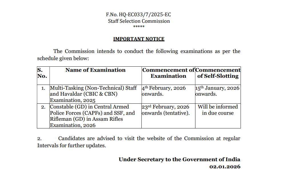 कर्मचारी चयन आयोग (SSC) ने एमटीएस और जनरल ड्यूटी कॉन्स्टेबल दोनों भर्तियों की परीक्षा की तारीखें आधिकारिक रूप से घोषित कर दी हैं। सबसे पहले एमटीएस का एग्जाम 4 फरवरी 2026 से शुरू होगा। इसके बाद जीडी की परीक्षा आयोजित होगी। जीडी की परीक्षा के लिए 23 फरवरी के टेंटेटिव डेट जारी की गई है। अगर आप इस भर्ती में शामिल होने वाले हैं और फॉर्म अप्लाई किया है तो आप परीक्षा का शेड्यूल आधिकारिक वेबसाइट ssc.gov.in से भी ऑनलाइन चेक कर सकते हैं। शेड्यूल के हिसाब से ही आपको अब अपनी तैयारी करनी होगी।