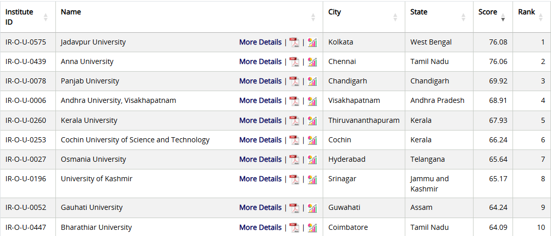 स्टेट पब्लिक यूनिवर्सिटीज के मामले में तमिलनाडु की हिस्सेदारी टॉप 50 में सबसे ज्यादा है। तमिलनाडु के 10 संस्थान टॉप 50 में शामिल हैं। केरल और कर्नाटक, महाराष्ट्र, उत्तर प्रदेश, दिल्ली के 4-4 संस्थान टॉप 50 में शामिल हैं। आंध्र प्रदेश, हरियाणा, जम्मू-कश्मीर के 3-3 संस्थान , पश्चिम बंगाल और असम के 2-2, गुजरा की एक यूनिवर्सिटी टॉप 50 में शामिल है।