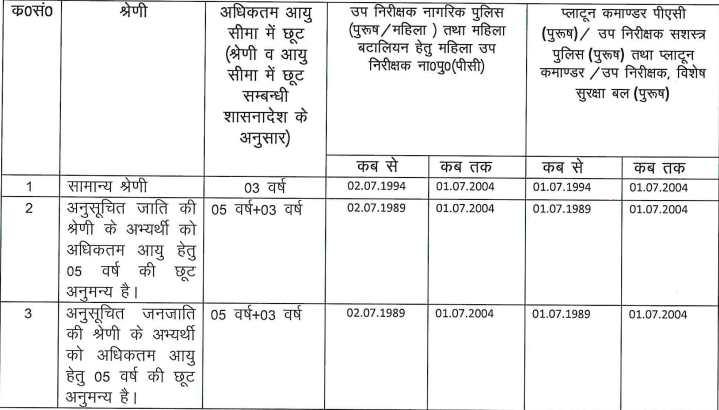 हालांकि, इस भर्ती में उत्तर प्रदेश सरकार ने उम्र सीमा में छूट दी है। आरक्षित कैटेगरी के उम्मीदवारों को निर्धारित छूट दी जाएगी। इसके अलावा सभी कैटेगरी के उम्मीदवारों को सिर्फ इस भर्ती के लिए 3 साल की छूट दी जा रही है। अनारक्षित कैटेगरी में अब 02-07-1994 से 01-07-2004 के बीच पैदा हुए उम्मीदवार अप्लाई कर पाएंगे।