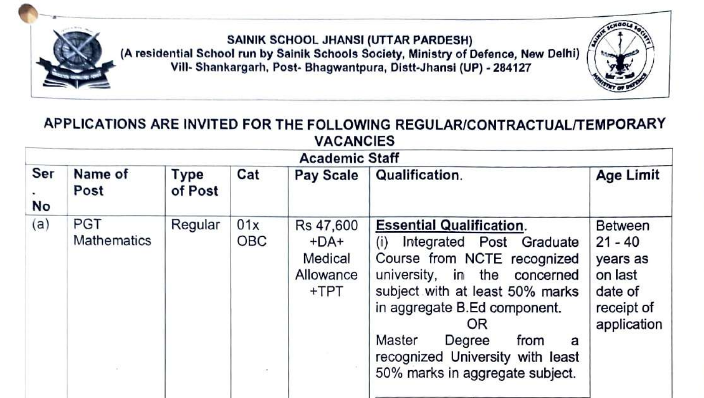 उत्तर प्रदेश के झांसी में स्थित सैनिक स्कूल में टीचिंग और नॉन टीचिंग पदों पर भर्तियां निकली हैं। इन पदों के लिए ऑफलाइन मोड में 22 नवंबर तक अप्लाई कर सकते हैं।