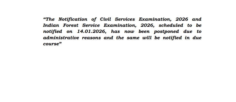 संघ लोक सेवा आयोग (UPSC) आज यानी 14 जनवरी को UPSC सिविल सेवा परीक्षा (CSE) 2026 और इंडियन फॉरेस्ट सर्विस (IFS) परीक्षा का नोटिफिकेशन जारी करने वाला था। आज जब लाखों छात्र इस नोटिफिकेशन का इंजतार कर रहे थे तो UPSC ने अचानक इस नोटिफिकेशन को स्थगित कर दिया है। नोटिफिकेशन स्थगित करने की जानकारी UPSC ने अपनी आधिकारिक वेबसाइट upsc.gov.in पर एक नोटिफिकेश में शेयर की।