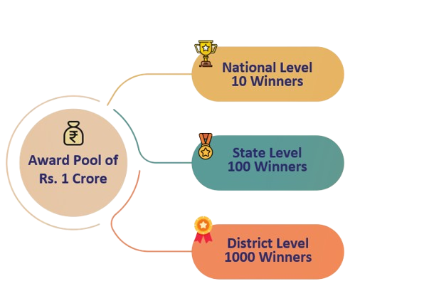 इस प्रतियोगिता में नेशनल लेवल पर 10 विजेता घोषित किए जाएंगे। इन विजेताओं को कुल 1 करोड़ का इनाम दिया जाएगा। साथ ही सभी जिला स्तर, राज्य स्तर और नेशनल लेवल के विजेताओं को सम्मानित भी किया जाएगा। विजेताओं को पेटेंट फाइल करने , स्टार्टअप्स बनाने के लिए सहायता मिलेगी।