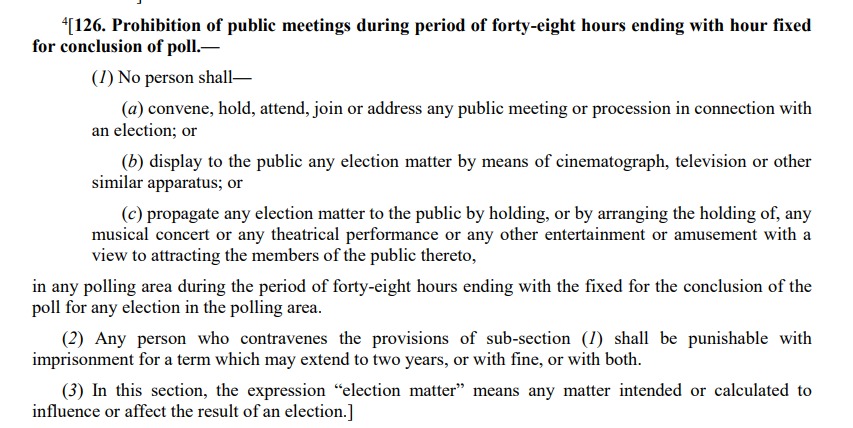 धारा 126 चुनाव से पहले आखिरी 48 घंटे के दौरान लागू रहती है। इस दौरान कोई भी उम्मीदवार पोलिंग बूथ के आसपास रैली या कोई सभा नहीं कर सकता। लाउडस्पीकर, टीवी, सिनेमा या होर्डिंग से प्रचार पर भी रोक रहती है। वोटर्स को लुभाने के मकसद से कोई नाटक या कंसर्ट नहीं कर सकता। इसके अलावा, उम्मीदवार अपने चुनाव से जुड़ी बातों का प्रचार भी नहीं कर सकता। कुल मिलाकर, उम्मीदवार ऐसा कुछ भी नहीं कर सकता, जिससे वोटर्स के प्रभावित होने की संभावना हो।