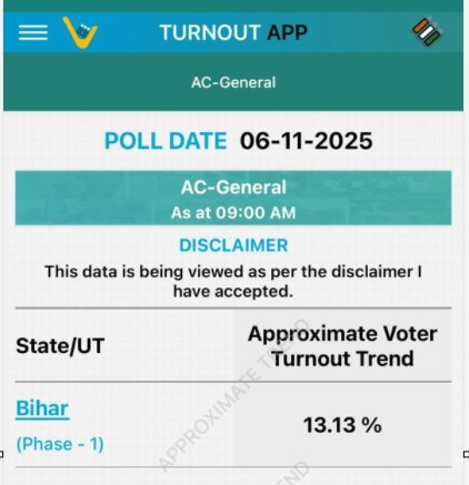 बिहार में पहले फेज की 121 सीटों पर वोटिंग जारी है। चुनाव आयोग की वोटर टर्नआउट ऐप के मुताबिक, सुबह 9 बजे तक बिहार में 13.13% वोटिंग हो चुकी हैं। सबसे ज्यादा 15.27% वोटिंग सहरसा जिले में हुई है।