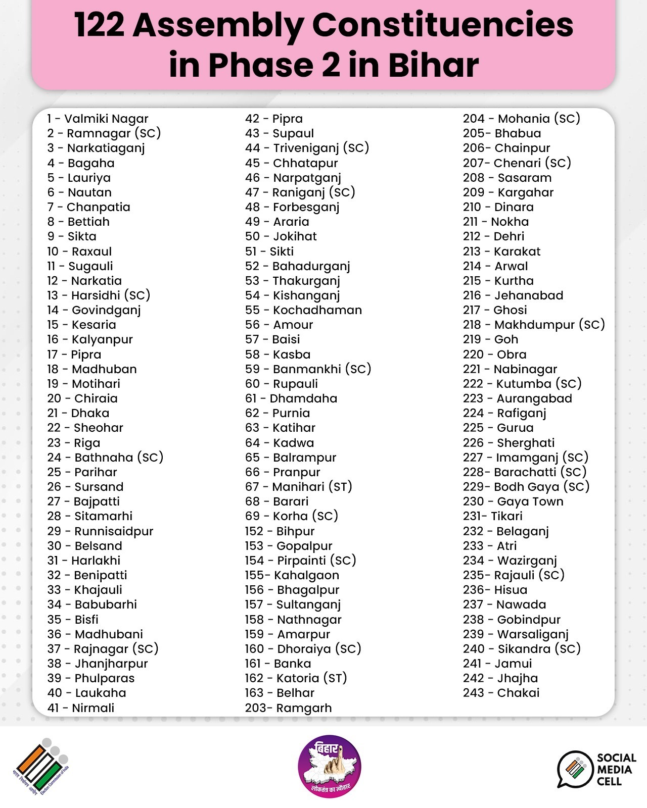 दूसरे चरण में 20 जिलों की 122 सीटों पर वोटिंग हो रही है। यहां देखिए लिस्ट:-