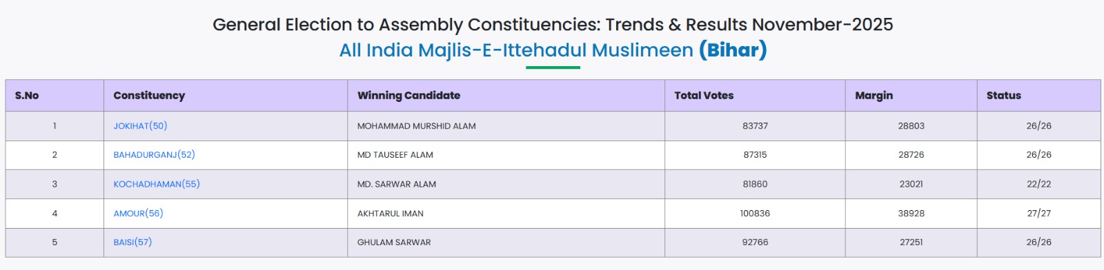 इस बार AIMIM से जो 5 विधायक बने हैं, उनमें मोहम्मद मुर्शिद आलम (जोकिहाट), मोहम्मद तौसिफ आलम (बहादुरगंज), मोहम्मद सरवर आलम (कोचाधामन), अख्तरुल ईमान (अमौर) और गुलाम सरवर (बैसी) शामिल हैं।