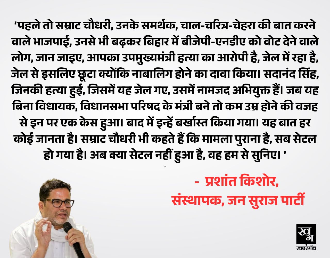 प्रशांत किशोर ने सम्राट चौधरी पर आरोप लगाया है कि वह हत्या के आरोपी हैं। उन्होंने आरोप लगाया है, 'सम्राट चौधरी, बिहार के उपमुख्यमंत्री हैं। भाई साहब नाम बदलने के विशेषज्ञ हैं। इनका नाम राकेश कुमार। बाद में हुआ राकेश कुमार उर्फ सम्राट चौधरी। इनका असली नाम सम्राट कुमार मौर्य। यह उनका पहला नाम है। 1998 में इन पर एक हत्या का आरोप लगा। सदानंद सिंह, कांग्रेस के बड़े नेता थे, इनके परिवार के राजनीतिक विरोधी थे, उनको बम से मारकर उनकी हत्या कर दी गई। लोग बताते हैं कि इस हत्याकांड में 6 लोगों की मौत हुई। उस केस में आज के सम्राट चौधरी और तब के सम्राट कुमार मौर्य, आरोपी थे। बकायदा जेल गए। 6 महीने के बाद जेल से निकले। नाबालिग होने के नाम पर इन्हें जेल से निकाला गया।'