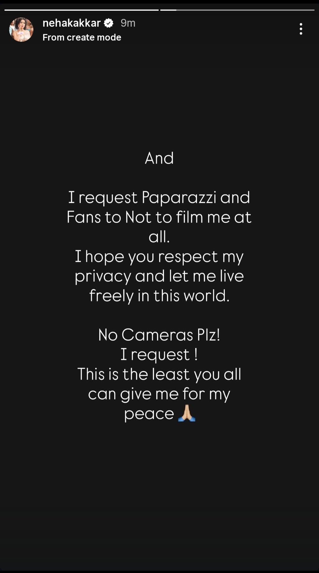 नेहा ने एक नहीं बल्कि कई स्टोरीज पोस्ट की। एक स्टोरी में उन्होंने पैपराजी और फैंस से उनकी फोटो ना लेने की अपील की। उन्होंने कहा, 'मैं पैपराजी और फैंस से विनती करती हूं कि मेरी फोटो या वीडियो ना लें। उम्मीद करती हूं कि आप मेरी प्राइवेसी की इज्जत करेंगे और मुझे इस दुनिया में आजाद जिंदगी जीने देंगे।'
