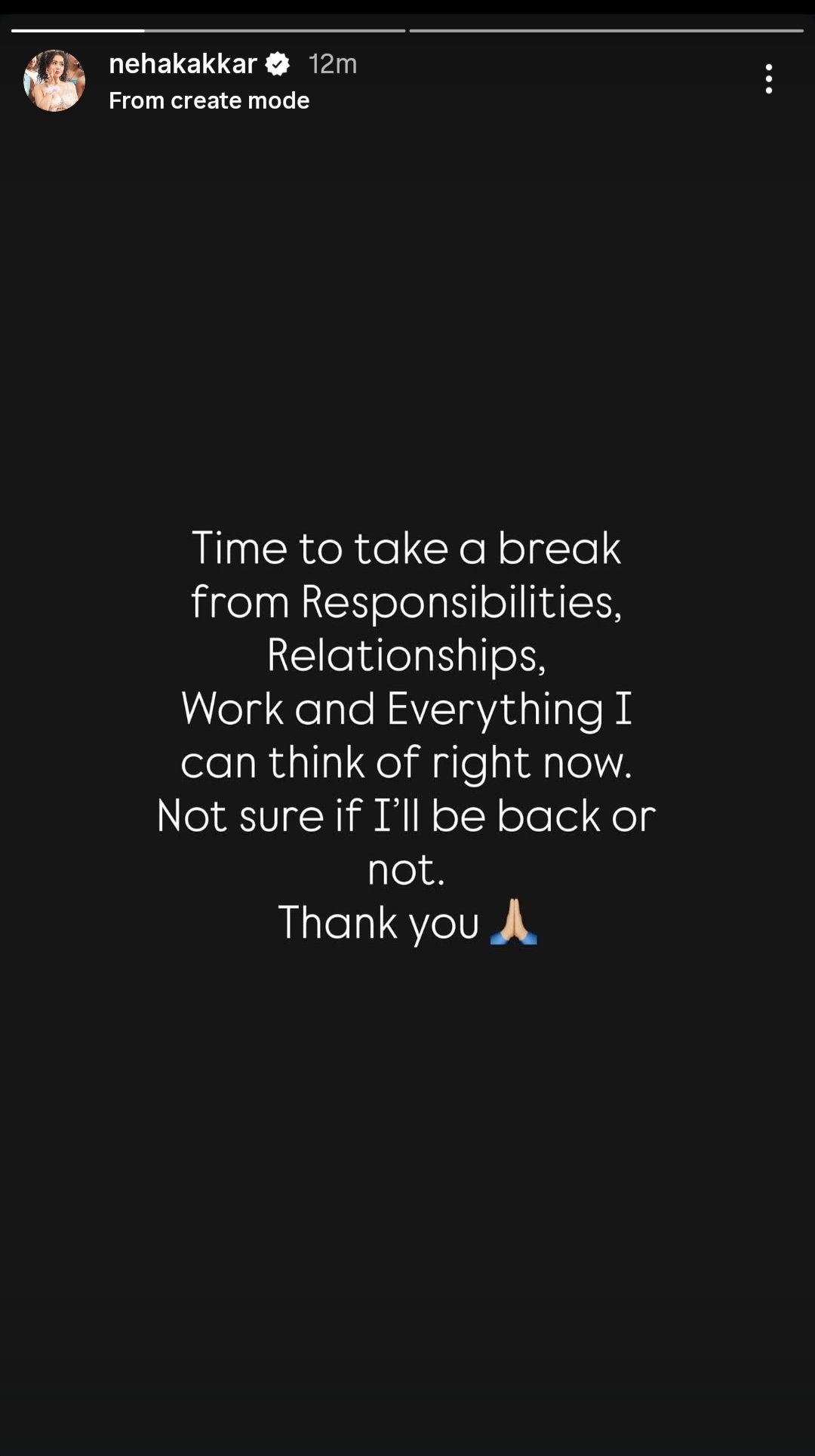नेहा कक्कड़ ने सोशल मीडिया अकाउंट इंस्टाग्राम पर स्टोरी शेयर की। इस स्टोरी में उन्होंने लिखा, 'अब ब्रेक लेने का समय आ गया है। जिम्मेदारियों से, रिश्तों से, काम से और हर उस चीज से जिसके बारे में मैं इस समय सोच पा रही हूं। मैं नहीं जानती कि मैं वापस लौटूंगी भी या नहीं। धन्यवाद।' नेहा ने कुछ ही समय बाद इस पोस्ट को सोशल मीडिया से हटा भी दिया लेकिन तब तक लाखों फैंश तक उनकी यह पोस्ट पहुंच चुकी थी।