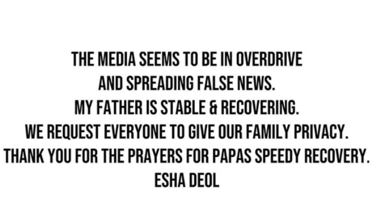 धर्मेंद्र की बेटी एशा देओल ने लिखा, 'लगता है कि मीडिया जरूरत से ज्यादा सक्रियता दिखा रहा है और झूठी खबरें फैला रहा है। मेरे पिता की हालत स्थिर है और उनके स्वास्थ्य में सुधार हो रहा है। हम सभी से अनुरोध करते हैं कि हमारे परिवार की निजता का सम्मान करें। पापा के जल्द स्वस्थ होने की प्रार्थनाओं के लिए धन्यवाद।'