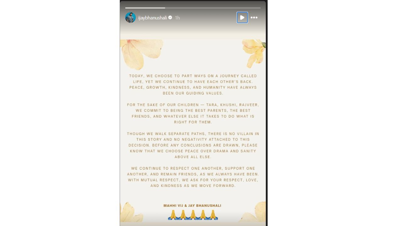 जय और माही ने अपने इंस्टाग्राम पर पोस्ट शेयर कर लिखा, 'आज हम एक ऐसे मोड़े पर पहुंचे हैं जिसे जीवन ने हमारे लिए चुना है। हमने साथ मिलकर प्यार, तरक्की, समझदारी और इंसानियत की साझा कीमतों को आगे बढ़ाया है। हम सबसे पहले अच्छे दोस्त रहेंगे और जो भी जिंदगी हमारे सामने लाएगी उसका सामना हम पूरे सम्मान और समझदारी के साथ करेंगे। हम अपने बच्चों खुशी, राजवीर और तारा की परवरिश मिलकर करेंगे। हम उनके लिए वे फैसले लेंगे जो उनके लिए सही होंगे।'