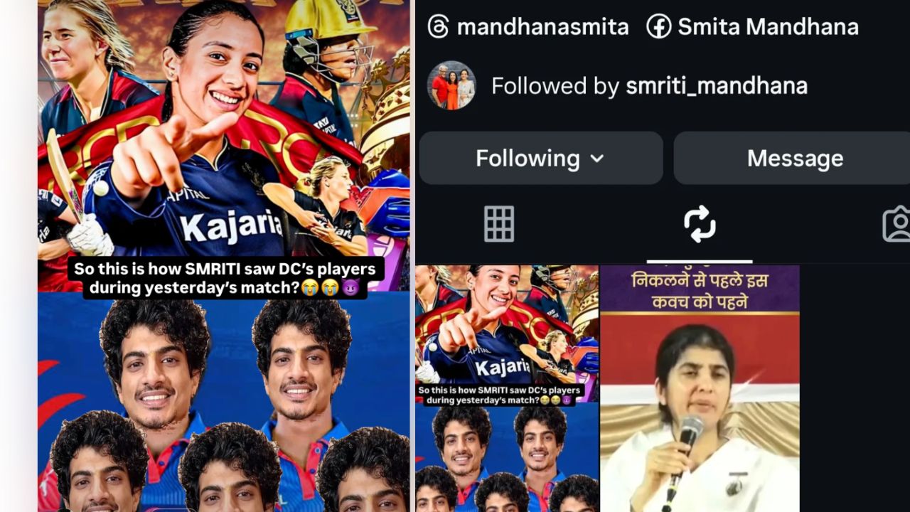 सोशल मीडिया मीम पेज ने स्मृति के प्रदर्शन को लेकर एक मीम शेयर किया। इसमें लिखा था कि जिस तरह से उन्हें डीसी के गेंदबाजों की धुलाई की। ऐसा लग रहा था कि मानो उन्हें सभी गेंदों में अपने एक्स पलाश का चेहरा दिख रहा हो। इस मीम को स्मृति मंधाना की मां ने अपने इंस्टाग्राम पर शेयर किया है।