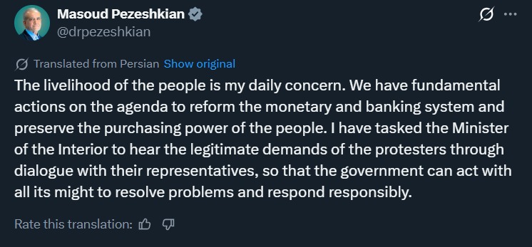 ईरान में चार दिन से बड़े पैमाने पर विरोध प्रदर्शन हो रहे हैं। इस बीच ईरान के राष्ट्रपति मसूद पेजेश्कियान ने कहा कि वह प्रदर्शनकारियों से बात करने के लिए तैयार हैं।