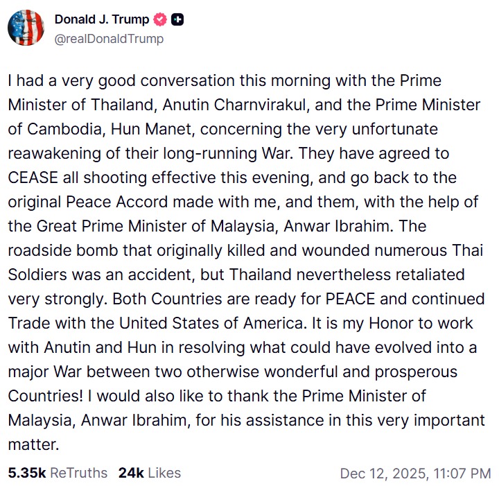 शुक्रवार को ट्रंप ने थाईलैंड और कंबोडिया के प्रधानमंत्रियों से बातचीत के बाद ट्रुथ सोशल पर पोस्ट किया कि दोनों सीजफायर के लिए राजी हो गए हैं।