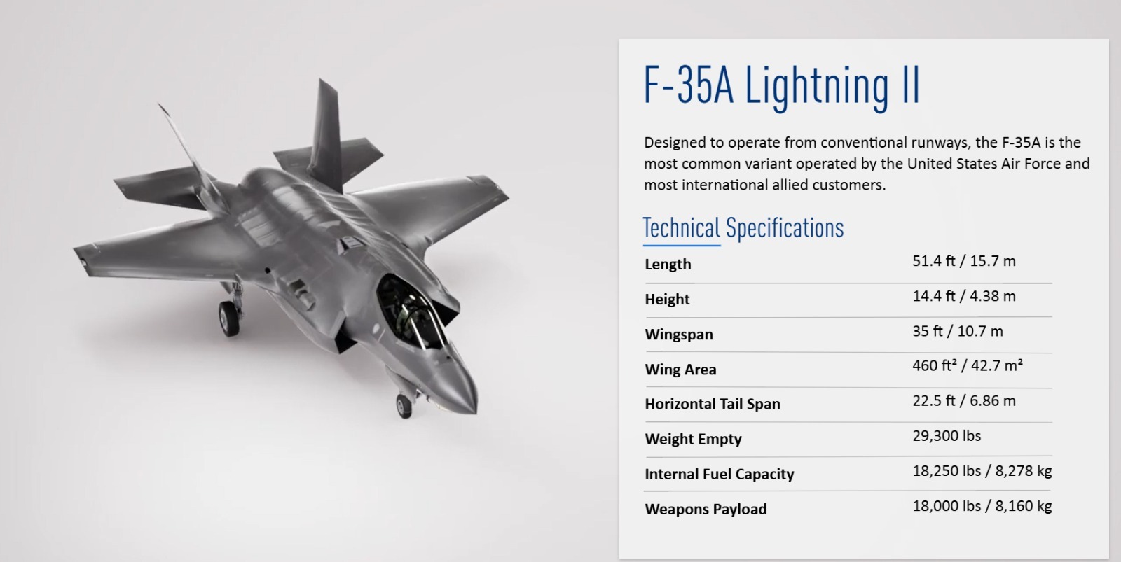 इस विमान की लंबाई 51.4 फीट और ऊंचाई 14.4 फीट है। इसमें 8,278 किलो का ईंधन भरा जा सकता है। इसके साथ ही 8,160 किलो के हथियारों को लोड किया जा सकता है। F-35 विमान 1,931 किलोमीटर प्रति घंटे की रफ्तार से उड़ सकता है। इसकी कॉम्बैट रेडियस 1,093 किलोमीटर है। इसका मतलब हुआ कि F-35 विमान 1,093 किलोमीटर तक जा सकता है और वापस लौट सकता है। इस दौरान इसमें रिफ्यूलिंग की जरूरत नहीं होती।