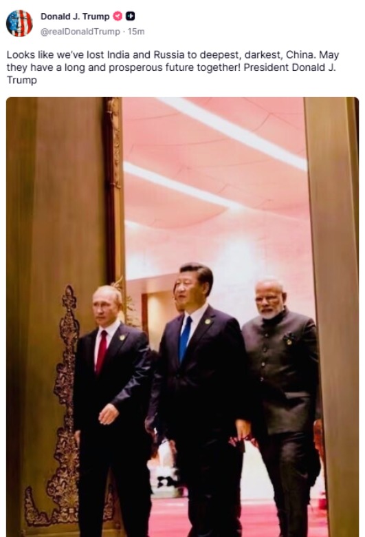 शुक्रवार को ट्रंप ने ट्रुथ सोशल पर पीएम मोदी, जिनपिंग और पुतिन की तस्वीर साझा की थी। इसके साथ उन्होंने लिखा था, 'लगता है हमने भारत और रूस को चीन के हाथों गंवा दिया है। उम्मीद है उनका भविष्य अच्छा होगा।' उन्होंने चीन को 'डार्केस्ट कंट्री' बताया था।