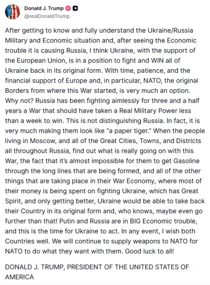 ट्रुथ सोशल पर अपनी पोस्ट में ट्रंप ने कहा, 'रूस-यूक्रेन की सैन्य और आर्थिक स्थिति को पूरी तरह से जानने और समझने के बाद और रूस को हो रही आर्थिक परेशानी को देखने को बाद युद्ध पर नजरिया बदल गया है।' उन्होंने कहा कि 'पुतिन और रूस गंभीर आर्थिक संकट में है और यूक्रेन के लिए यह कार्रवाई करने का समय है।'