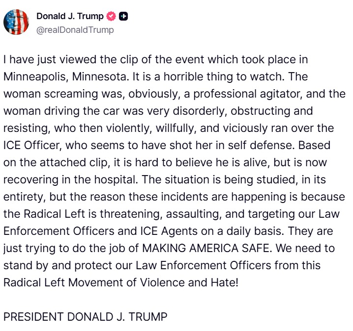 ट्रंप ने ट्रुथ सोशल पर लिखा, 'मैंने अभी मिनियापोलिस में हुई घटना का क्लिप देखा है। यह देखना बहुत भयानक है। चिल्लाने वाली महिला साफ तौर पर एक प्रोफेशनल हंगामा करने वाली थी और कार चलाने वाली महिला बहुत ही बदतमीज थी, रुकावट डाल रही थी और विरोध कर रही थी, जिसने फिर हिंसक रूप से जानबूझकर और बेरहमी से ICE ऑफिसर को कुचल दिया और उसने शायद अपनी जान बचाने के लिए उसे गोली मार दी।'