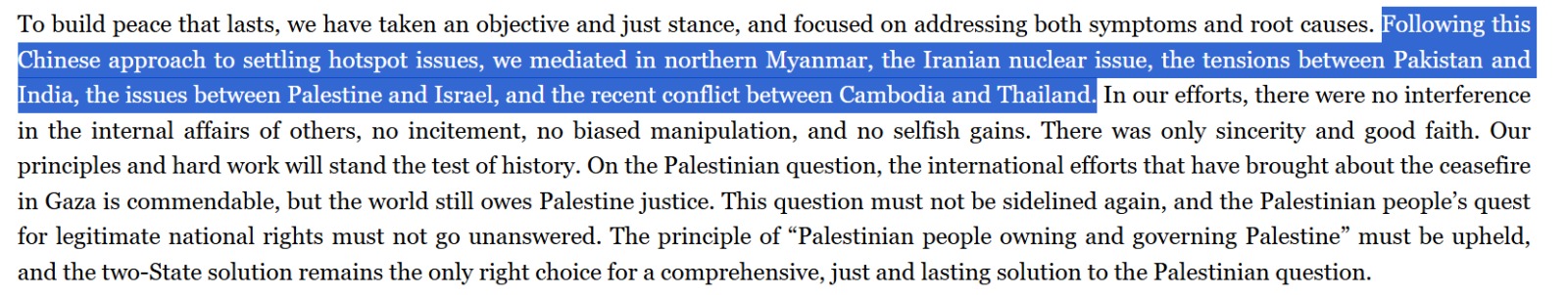 विदेश मंत्री वांग यी ने कहा, 'स्थायी शांति के लिए हमने एक निष्पक्ष और न्यायसंगत रुख अपनाया है।' उन्होंने कहा, 'हमने उत्तरी म्यांमार, ईरानी परमाणु मुद्दे, पाकिस्तान और भारत के बीच तनाव, फिलिस्तीन और इजराइल के बीच मुद्दों और कंबोडिया-थाईलैंड के बीच हालिया संघर्ष में मध्यस्थता की है।'